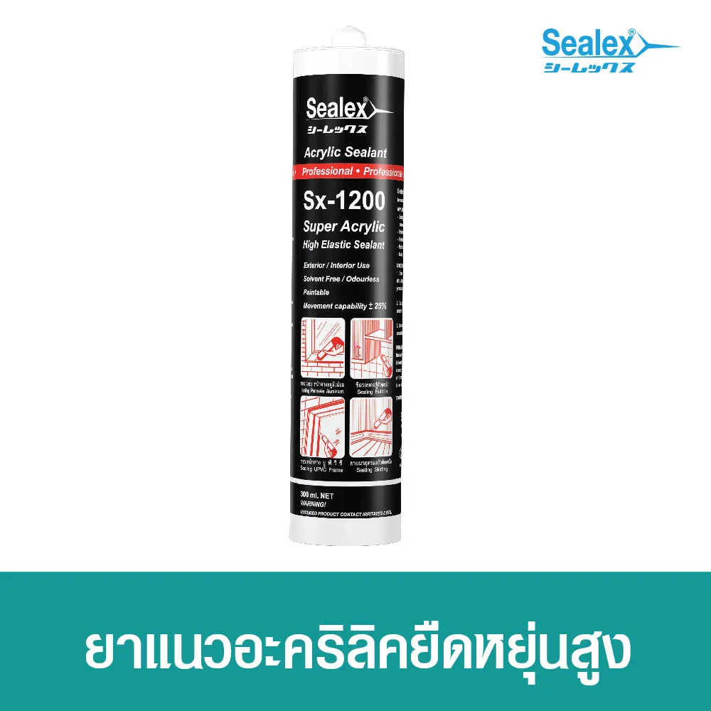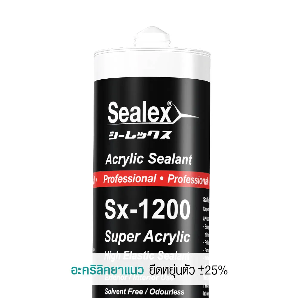 กาวอะคริลิค ซุปเปอร์อะคริลิก Sealex Sx-1200 ยืดหยุ่นสูง สีขาวเนียน เหมาะสำหรับงานซีลรอยต่อ รอยแตกร้าวเล็กๆ ตกแต่งผิวงานภายใน ยึดเกาะดี แห้งไว ไร้กลิ่นฉุน ไม่ทำให้เกิดคราบเหลือง